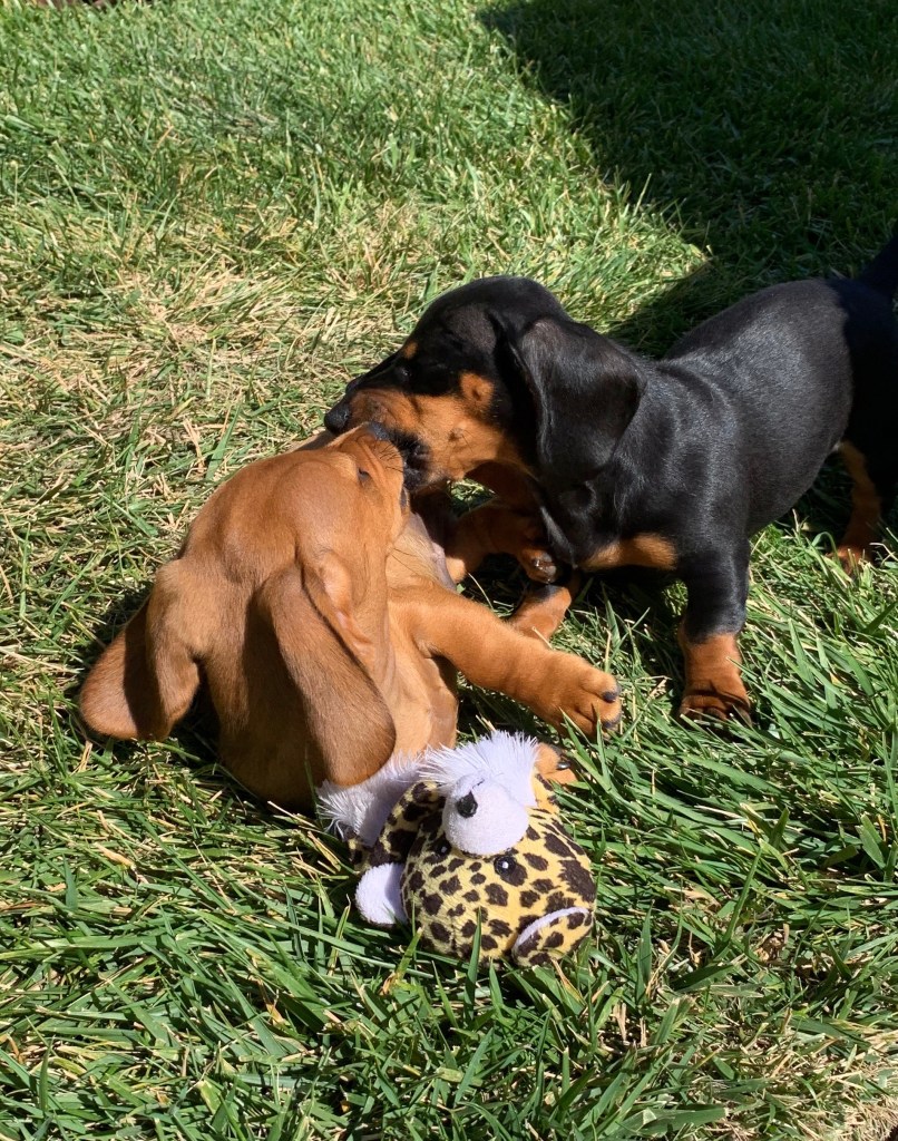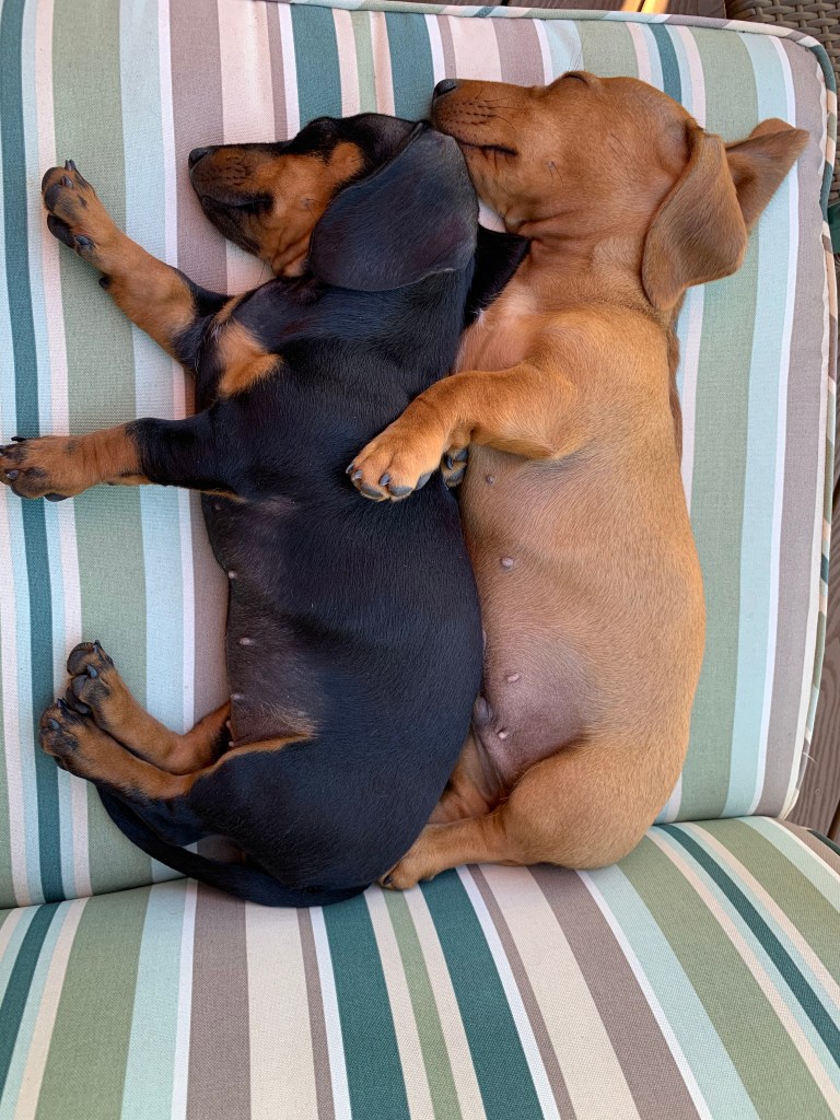 Speaking of bedtime, I recall in that last blog post that I talked about crying puppies. After consulting the village, I got several differing opinions on how to make bedtime a smooth transition. When the pups first arrived, they slept together on the mid-level of our tri-level house, while we slumbered on the top level. They had each other, water, and a pee pad. This worked for about ten days and was replaced with crying that progressed to howling at the bottom of the steps. Just like my babies, I could not bear these heartrending cries. But I definitely did not want these little creatures in our bed. Our other doxies always slept in their beds alongside ours … but these two definitely had their own needs and ideas. So yes, we caved, and they sleep with us. After their “transition to the bedroom crazies” are over, they come up on the bed and curl up next to us. After this sleep-deprived stressful experience, I realized that sometimes you and your pups have to make your own path.