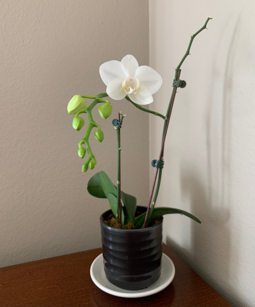 Yesterday, I was wrapping gifts on our desk. On a corner, out of harm’s way, a blooming orchid glowed in filtered sunshine. The beauty and serenity of the plant accompanied me as I cut, taped, and labeled.