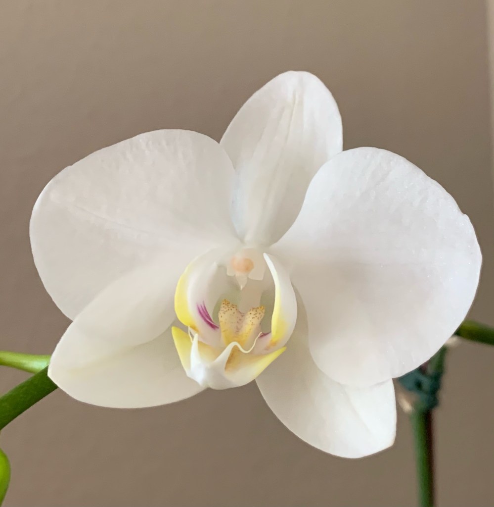 A dear neighbor had given us this orchid when our grandson James passed away early in the year. When it arrived, it was covered with white blossoms with faint purple streaks that covered two stalks. The blooms lasted and lasted until sometime in July, when one by one they began to fall. This is the point where an orchid in my care begins to produce nothing but leaves.