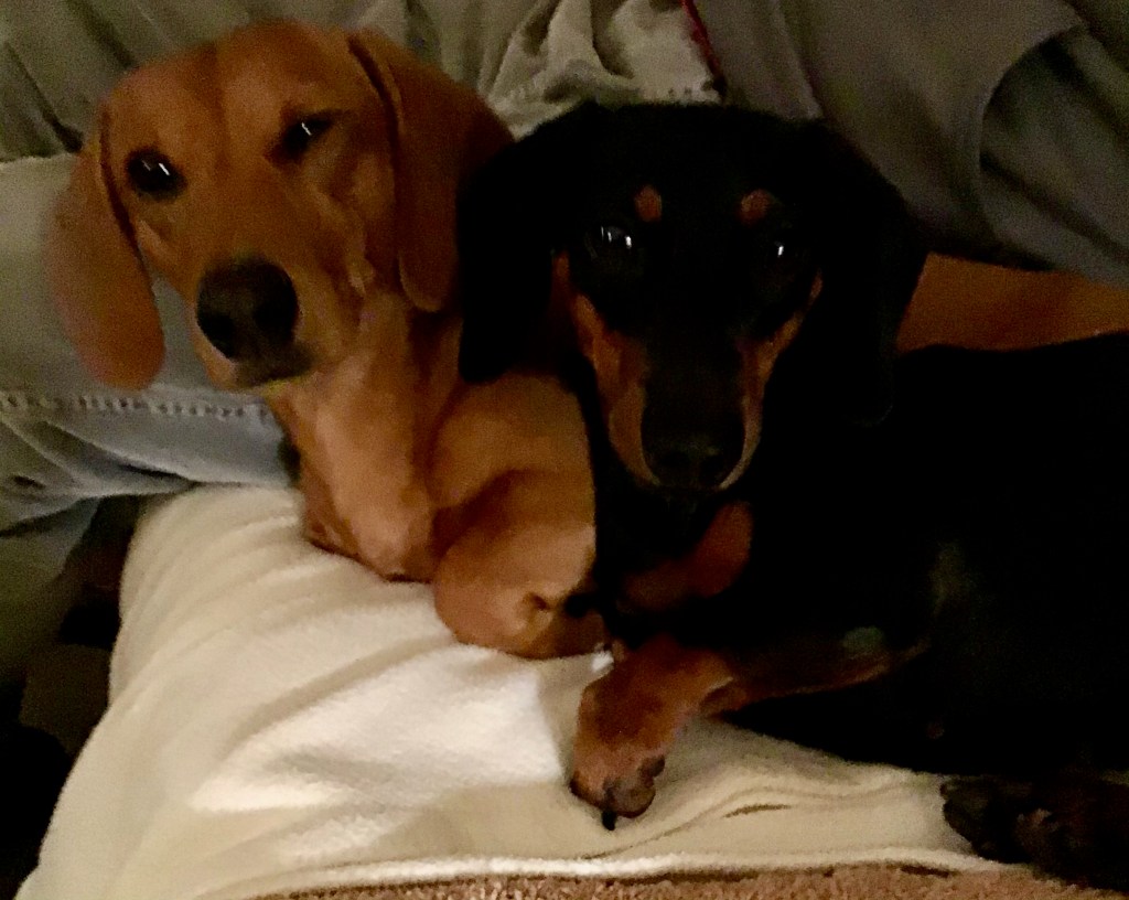 But you really cannot sit and stew and slide into depression when you own two mischievous nine-month-old dachshund puppies. On January 6, we had taken them on an extra-long early morning walk, and so they were pretty mellow the rest of the day. I think they were recharging their batteries, because the next day started out with ripping up the pee pad, and while I was trying to salvage what was left of it, they went outside to bark at the early morning golfers. I went outside to settle them down, and they dashed into the house. Teddy made a beeline for the couch and peed on the leg. About that time, John appeared and asked, “What’s happening?”
