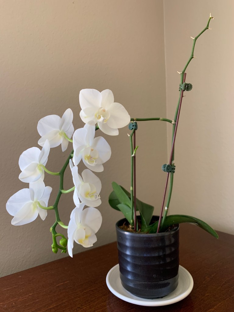 I’m looking at what I call my “James orchid,” a plant given to us when James passed. I think it is somewhat of an anomaly. After the original blossoms faded, the stems that held them did not die off but remained healthy. A few months later, I noticed a shoot growing off one of the stems. This ended up being another spray of the snowy blooms. I wrote about this surprising new growth in my December 20 blog.