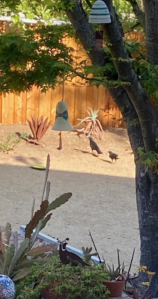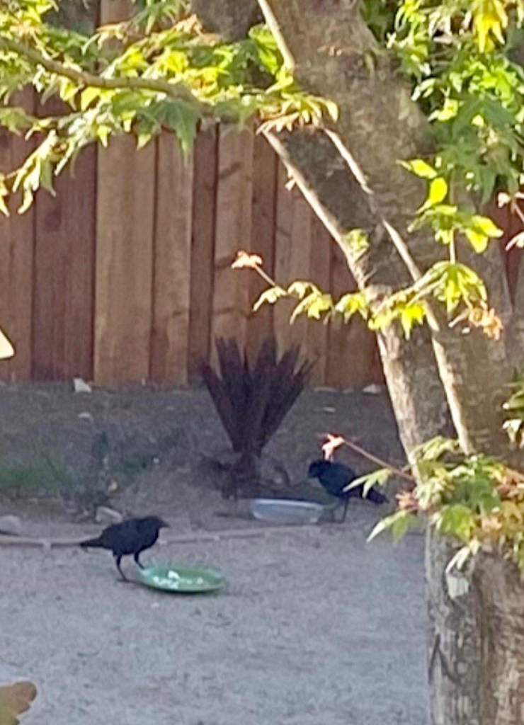 On Wednesday, Elaine heard loud cawing and a general ruckus in her front yard, so she investigated and discovered a fledgling crow under a jasmine bush. After investigating, she left the feathered parents and extended family to attend the adolescent. But first she had to cancel the gardeners.
