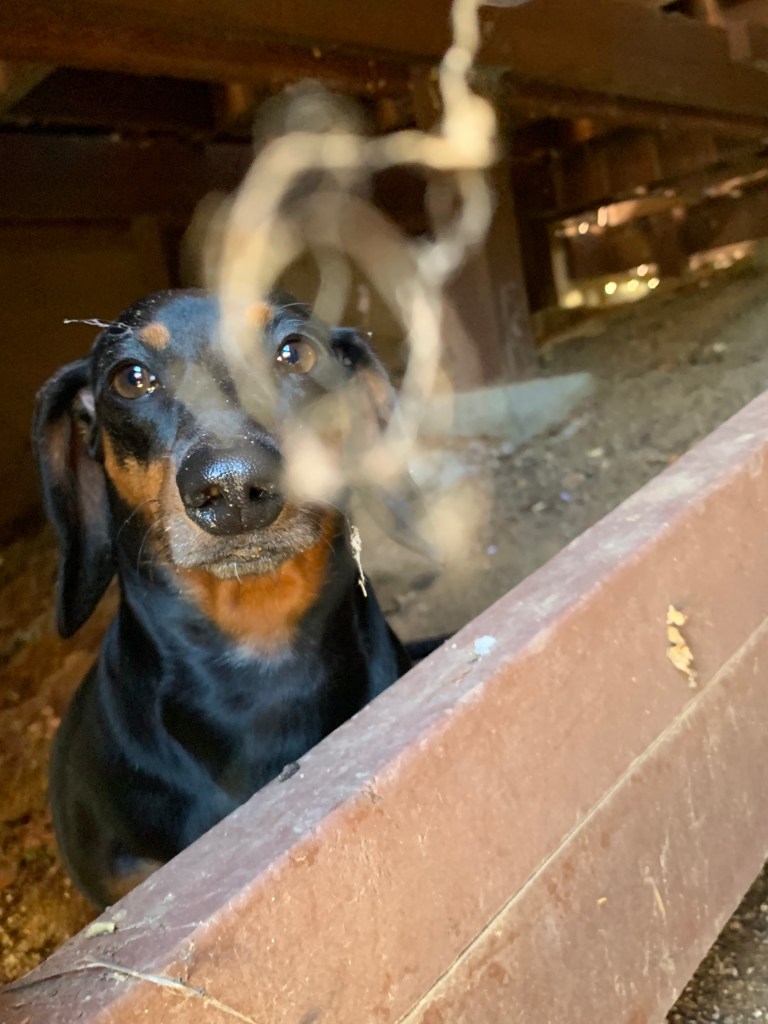 Teddy, who was taking all this in with a watchful eye, finally jumped over a small board and joined Sadie under the deck. He then turned around and came out. After this demonstration of “Look how easy this is,” the snout reappeared, and John grabbed Sadie by the scruff of the neck, and this story is thankfully winding down.