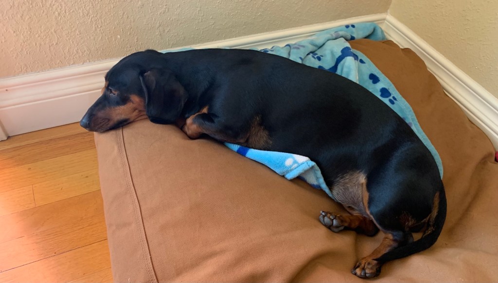 The drama all started last night when Sadie Lu went out for her last pee at about 11 p.m. and she spotted something, probably a rodent, disappear into the lavender bushes and slip under the deck. For hours she would not settle, going from a high-pitched whine even John could hear to outright barking while running from door to door. Finally, about 3 a.m., she draped herself around my head and fell asleep. Unbelievably, so did I while wearing a dachshund as a hat.