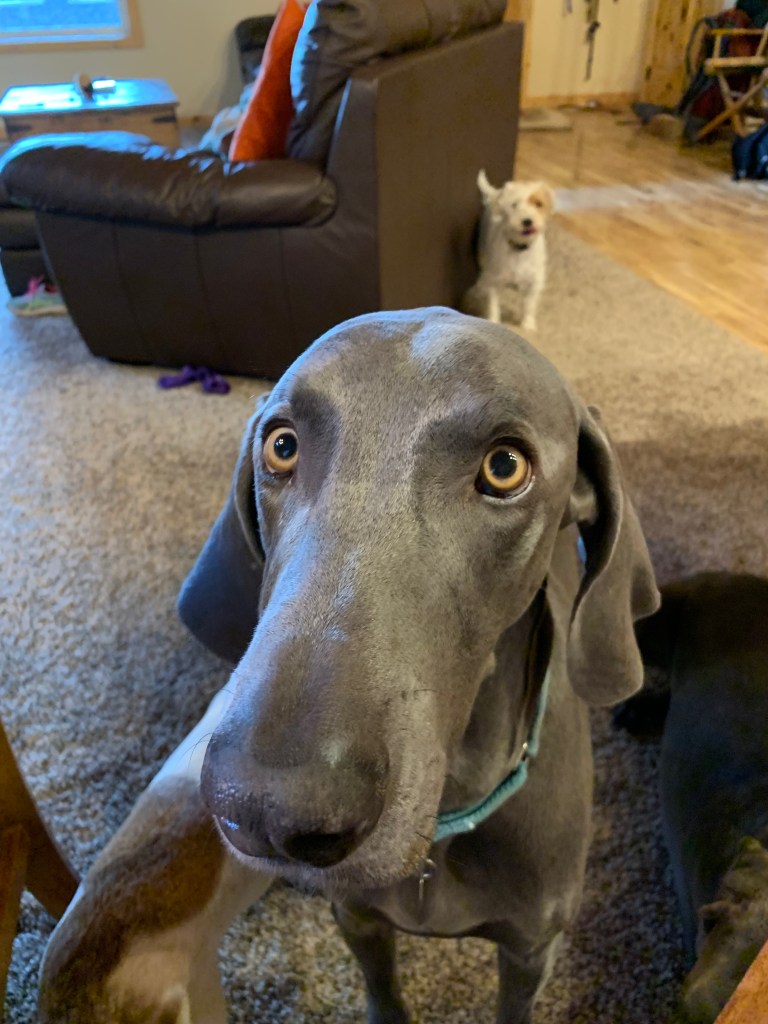 When we arrived at Duck Creek, we were greeted by our hosts, Mike and Dena; their two daughters, Collins and Madison; and their four canines. There would be no lack of doggie companionship here. Rusty, an elderly Jack Russell terrier, quickly bonded with John, and I fell in love with Rhys, a serious-minded Weimaraner.