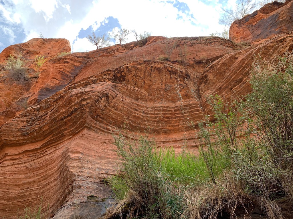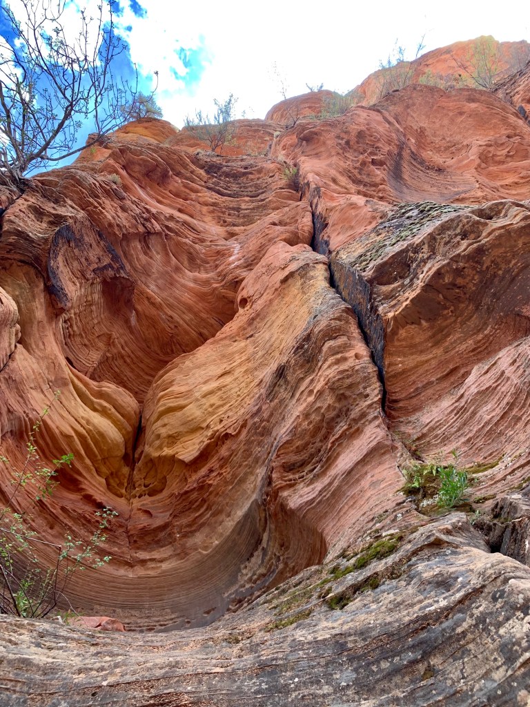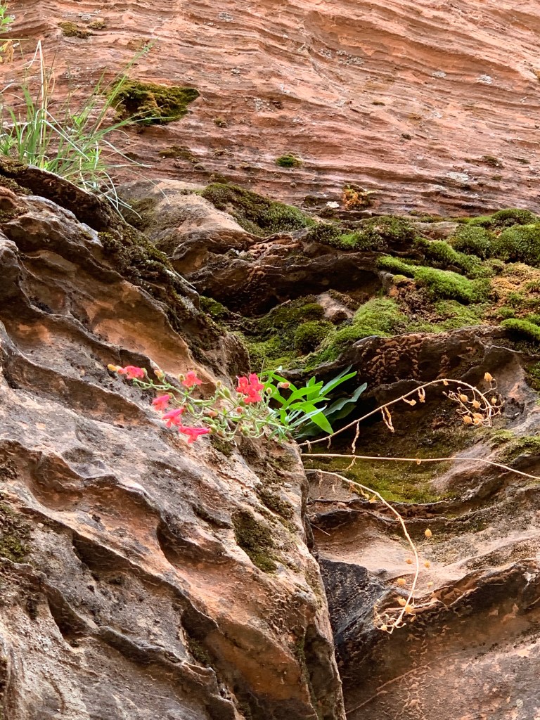 We spent one day in Zion National Park—a place everyone should see and almost impossible to describe. While in the park, a sudden downpour triggered a flash flood alert on my phone, but it also created a wall of waterfalls. We explored slot canyons with partially dried riverbeds, where you expected to see a dinosaur feeding on the sparse brush when you rounded a corner. There was a pervasive feeling that this was the very birthplace of the Earth’s crust. Everywhere you looked was a photo op: from the patterns made in the sand by fast-running water to the soaring red-and-gold cliff faces. John and I both were able to climb and hike, and even though it was scary at times, we could do it.